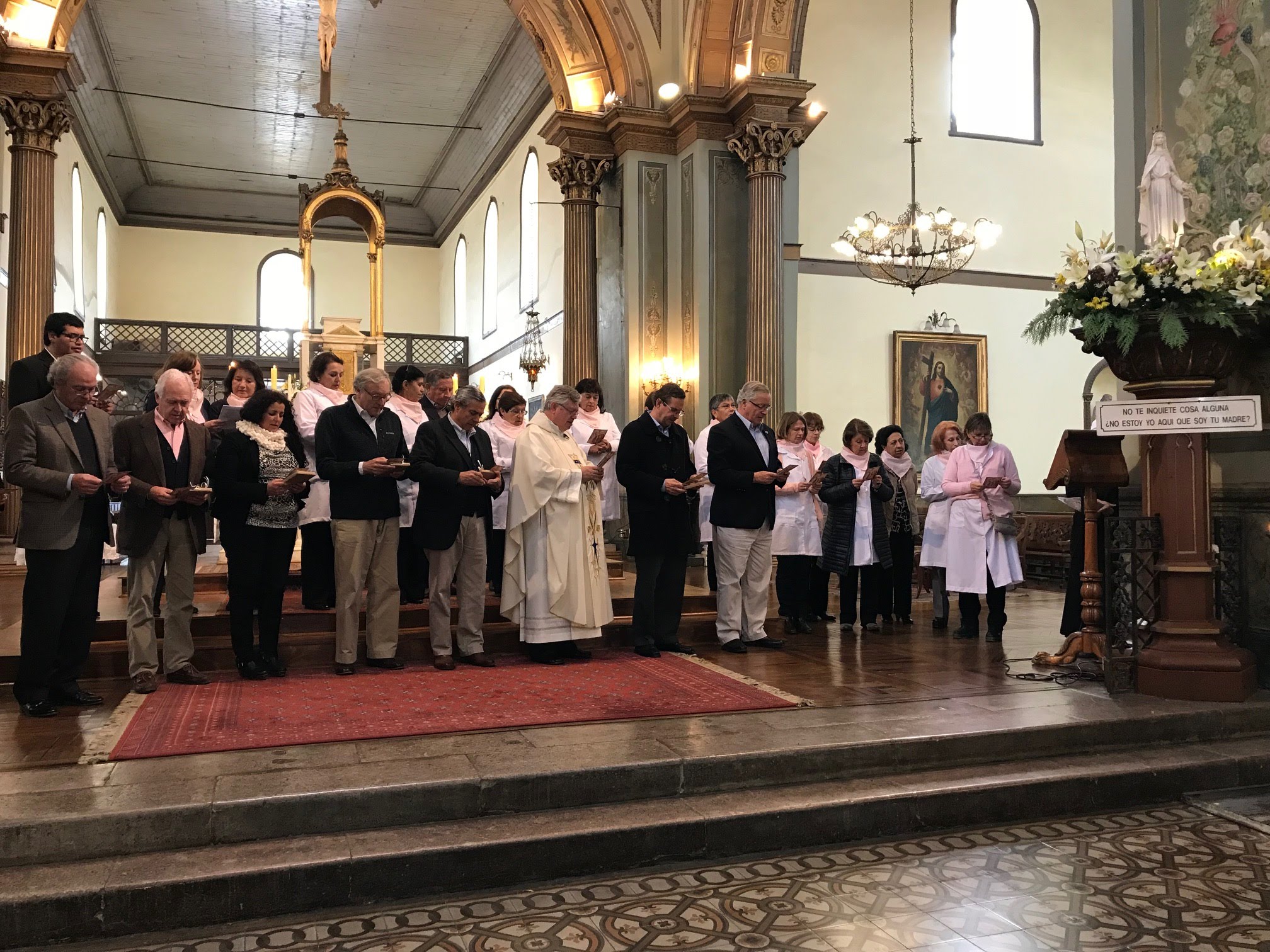 EN LA FOTO: Padre Andrés Ariztía dio la bendición a los signos de compromiso que recibieron 17 nuevas Damas de Blanco y 2 voluntarios Custodios San José. En la imagen, junto con cuatro nuevos padrinos de hogar, rezando a María Santísima la oración del Compromiso voluntario.